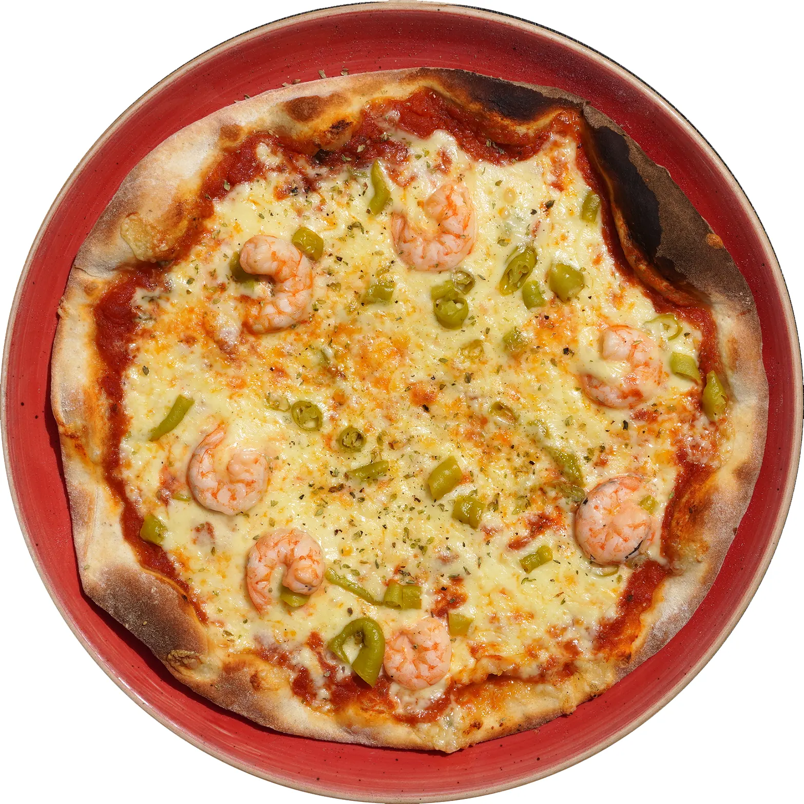 Tomate, mozzarella, ajo, guindillas y gambas.